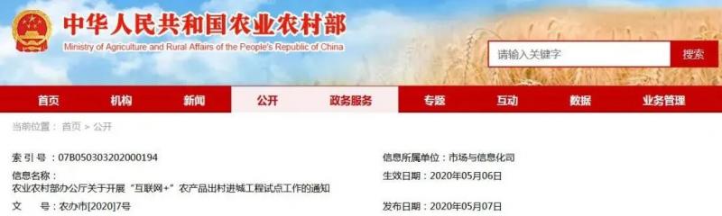 經國務院同意,農業農村部會同國家發展改革委、財政部、商務部印發了《關于實施“互聯網+”農產品出村進城工程的指導意見》。為貫徹落實文件部署要求,農業農村部決定開展“互聯網+”農產品出村進城工程試點工作,并制定了《“互聯網+”農產品出村進城工程試點工作方案》,現印發你們,請參照執行。