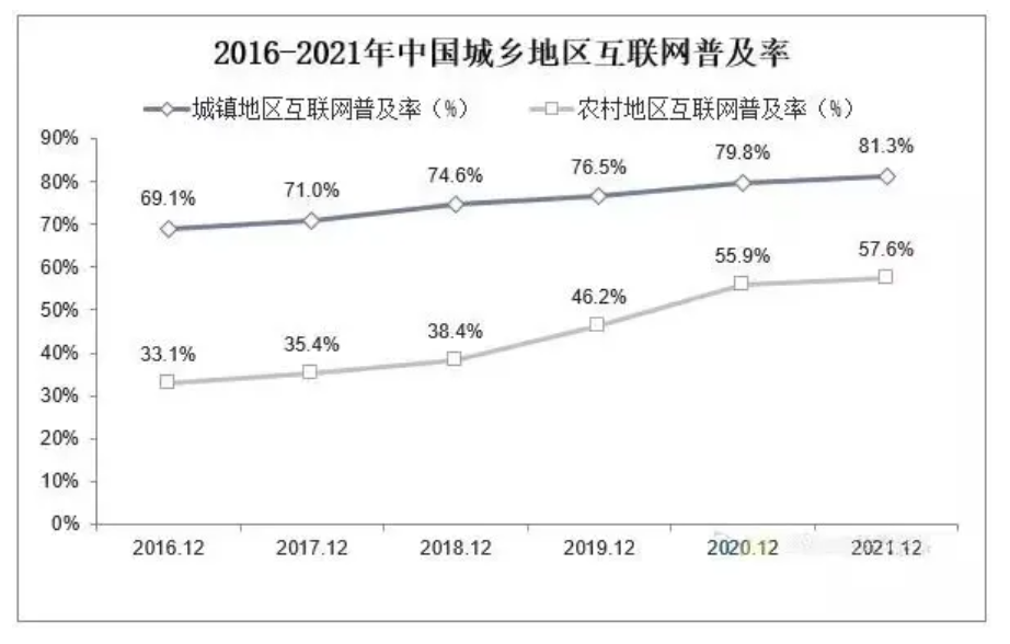 2022年6月,我國現(xiàn)有行政村已全面實現(xiàn)“縣縣通5G、村村通寬帶”。行政村通光纖比例從不到70%提升至100%,平均下載速率超過10OMb/s,基本實現(xiàn)與城市同網(wǎng)同速。農(nóng)村地區(qū)互聯(lián)網(wǎng)普及率進一步提升。據(jù)第50次《中國互聯(lián)網(wǎng)絡(luò)發(fā)展?fàn)顩r統(tǒng)計報告》顯示,2022年6月我國農(nóng)村網(wǎng)民規(guī)模2.93億。農(nóng)村地區(qū)互聯(lián)網(wǎng)普及率為58.8%。