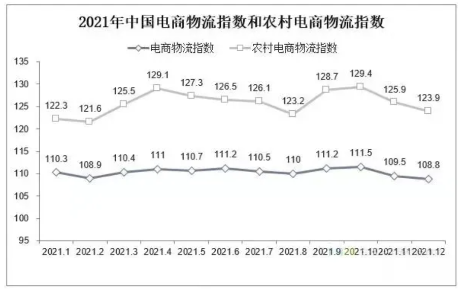 農(nóng)村物流網(wǎng)絡(luò)日益完善,郵政營業(yè)網(wǎng)點實現(xiàn)了鄉(xiāng)鎮(zhèn)全覆蓋,建制村全部通郵?!翱爝f進村”比例超過80%,交快、郵快、快快等合作進一步深化,共同配送、客貨郵融合等新模式不斷涌現(xiàn)。據(jù)國家郵政局?jǐn)?shù)據(jù)顯示,2021年農(nóng)村地區(qū)收投快遞包裹總量370億件,帶動農(nóng)產(chǎn)品出村進城和工業(yè)品下鄉(xiāng)進村超1.85萬億元。2021年,我國農(nóng)村電商物流指數(shù)保持平穩(wěn)增長態(tài)勢,全年均高于電商物流指數(shù)。