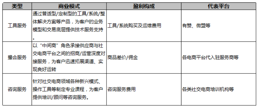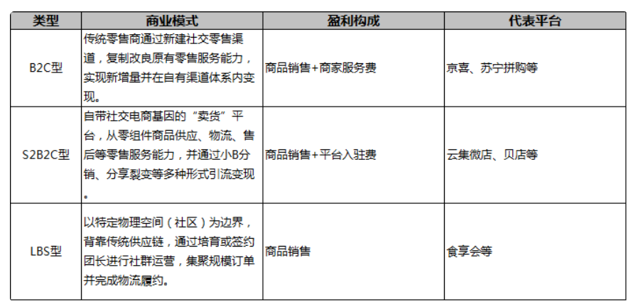 該模式下,平臺(tái)依托社交關(guān)系鏈促進(jìn)用戶裂變和商品傳播,按照平臺(tái)商品是否自營(yíng)同樣可分為2類,具體的商業(yè)模式與盈利構(gòu)成如下表: