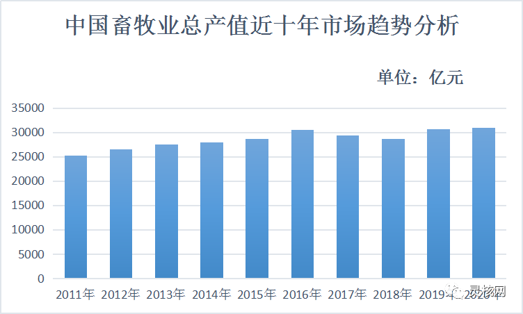 據(jù)統(tǒng)計(jì)局?jǐn)?shù)據(jù)顯示,2016年國(guó)內(nèi)畜牧業(yè)產(chǎn)值達(dá)30461.17億元,到2018年產(chǎn)值下降到28697.4億元。據(jù)2016年政府發(fā)布的《全國(guó)農(nóng)業(yè)現(xiàn)代化規(guī)劃(2016—2020年)》提出,到2020年我國(guó)畜牧業(yè)產(chǎn)值占農(nóng)業(yè)總產(chǎn)值比重超30%。