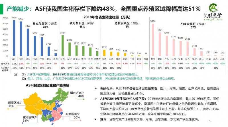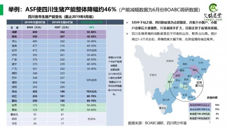 今年上半年以來,我們艾格農業畜牧團隊連續走訪了廣東、河南、山東、四川和東北地區,從調研結果來看:截止2019年6月,我們根據各省生豬去化幅度,測算目前國內生豬養殖量較疫情之前的減少約50%。