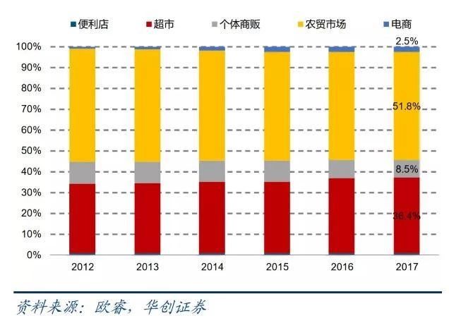 目前中國生鮮交易仍然以線下農貿市場為主,市場份額超過50%,生鮮電商的渠道份額僅2.5%。而從發展趨勢來看,農貿市場的渠道份額正在不斷萎縮,超市、電商渠道份額正在逐步增加,替代效應顯著。
