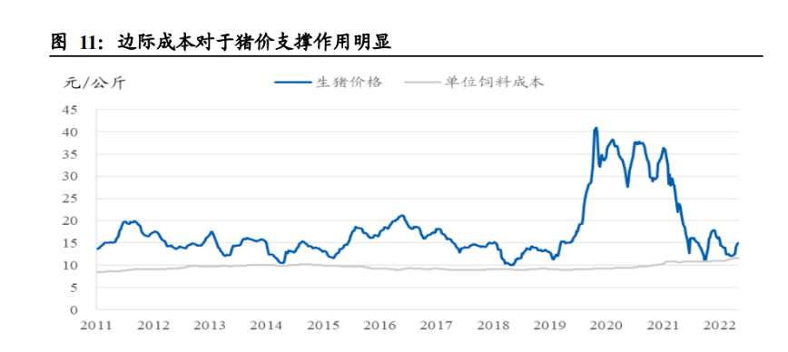楔形區(qū)間下邊界取決于邊際成本,上邊界對(duì)應(yīng)合理利潤。有時(shí)生豬產(chǎn)能過剩較為嚴(yán) 重,導(dǎo)致豬價(jià)下跌幅度較大,豬價(jià)明顯底部支撐。不同于市場主流的觀點(diǎn),我們認(rèn) 為豬價(jià)的成本支撐主要來自邊際成本,而非完全成本。對(duì)于養(yǎng)殖戶而言,前期仔豬 購買成本、固定資產(chǎn)折舊、疫苗藥物費(fèi)用、甚至包括人工成本(因雇工工資不會(huì)因 養(yǎng)殖數(shù)量減少而同比例減少)都屬于沉沒成本,并不會(huì)影響其是否繼續(xù)育肥的決策。邊際成本主要考慮的就是飼料成本,其他如水電等費(fèi)用占比較小。而生豬料肉比會(huì) 隨日齡增長而不斷提升,到達(dá)出欄階段料肉比普遍超過 3,即生豬體重每增加 1 公 斤需要飼喂 3 公斤飼料。如果當(dāng)前 1 公斤生豬價(jià)格低于 3 公斤飼料成本,養(yǎng)殖戶的 理性選擇就應(yīng)是停止育肥直接拋售。這就會(huì)導(dǎo)致生豬出欄體重低于正常水平,相當(dāng) 于減少了未來一段時(shí)間內(nèi)的豬肉供給,因而會(huì)對(duì)短期豬價(jià)形成較強(qiáng)支撐。正因如此, 飼料邊際成本構(gòu)成了豬價(jià)楔形區(qū)間的下邊界。而楔形區(qū)間的上邊界則對(duì)應(yīng)行業(yè)平均 合理利潤水平,一般情況為行業(yè)平均完全成本之上 10%-15%。