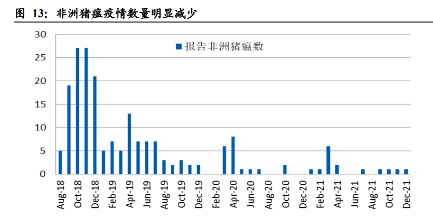 非洲豬瘟疫情得到有效緩解。當(dāng)前對(duì)于我國生豬養(yǎng)殖行業(yè)威脅最大的疫病當(dāng)屬非洲 豬瘟,從 2018 年 8 月爆發(fā)首起疫情至 2021 年末,累計(jì)共報(bào)告 196 起疫情,共撲殺 生豬 120 多萬頭。疫情最為嚴(yán)重的 2019 年,我國豬肉產(chǎn)量更是銳減 21.3%??梢哉f, 非洲豬瘟對(duì)生豬養(yǎng)殖行業(yè)以及國民生活都造成了巨大的沖擊。雖然目前尚未有合格 的疫苗或藥物面世,但我國生豬養(yǎng)殖行業(yè)自身通過不懈努力,采取加大飼料、豬舍 消毒力度等方式,使得疫情得到了基本控制。2021 年共報(bào)告非洲豬瘟疫情 15 起, 數(shù)量逐年減少,撲殺規(guī)模也大幅下降??傮w而言,疫情對(duì)生豬養(yǎng)殖行業(yè)產(chǎn)能影響逐 漸減小,但決不能滋生僥幸心理,避免疫情死灰復(fù)燃。