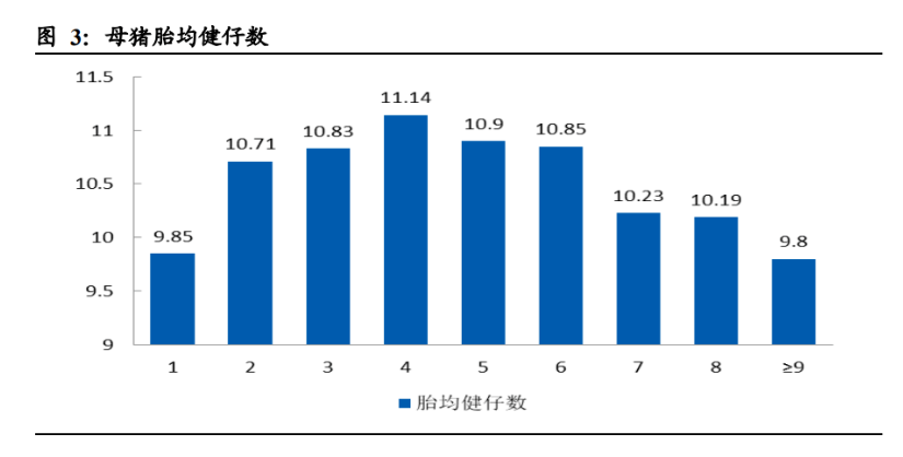 能繁母豬存欄是生豬養(yǎng)殖行業(yè)研究的核心。在配種過程中,公豬和母豬的合適配比 在 1:5 至 1:20,因此生豬產(chǎn)能的關(guān)鍵瓶頸還是在于母豬的存欄數(shù)量。一頭二元母豬 正常情況下能產(chǎn) 8-10 胎,平均每年可產(chǎn) 2.2-2.4 胎。綜合每胎產(chǎn)仔數(shù)和健仔率,母 豬的黃金生育階段在 3-6 胎。母豬是養(yǎng)殖場的核心資產(chǎn),養(yǎng)殖場一般不會(huì)主動(dòng)淘汰 胎齡小于 6 胎的高產(chǎn)母豬。