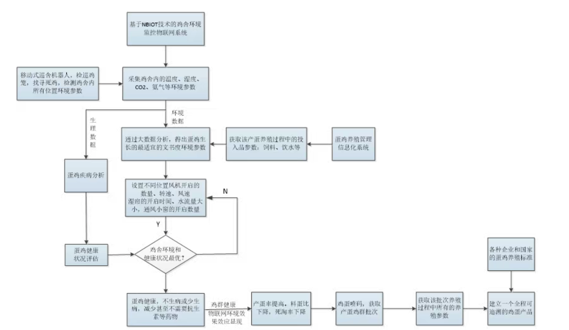 通過LORA/NB-IOT技術構建的雞舍物聯網環境監控系統(圖1)和集成傳感器的巡舍機器人,實現對蛋雞生長環境和生理狀況的全方位的監測。再結合生產過程信息化管理系統(圖2),實時對雞舍內的環境溫度、濕度、CO2、產蛋率、飲水率、飼喂量等蛋雞養殖信息的采集、存儲與分析,實現對雞舍環控終端設備的智能動態聯動控制,動態化調控構建蛋雞生長的適宜環境。