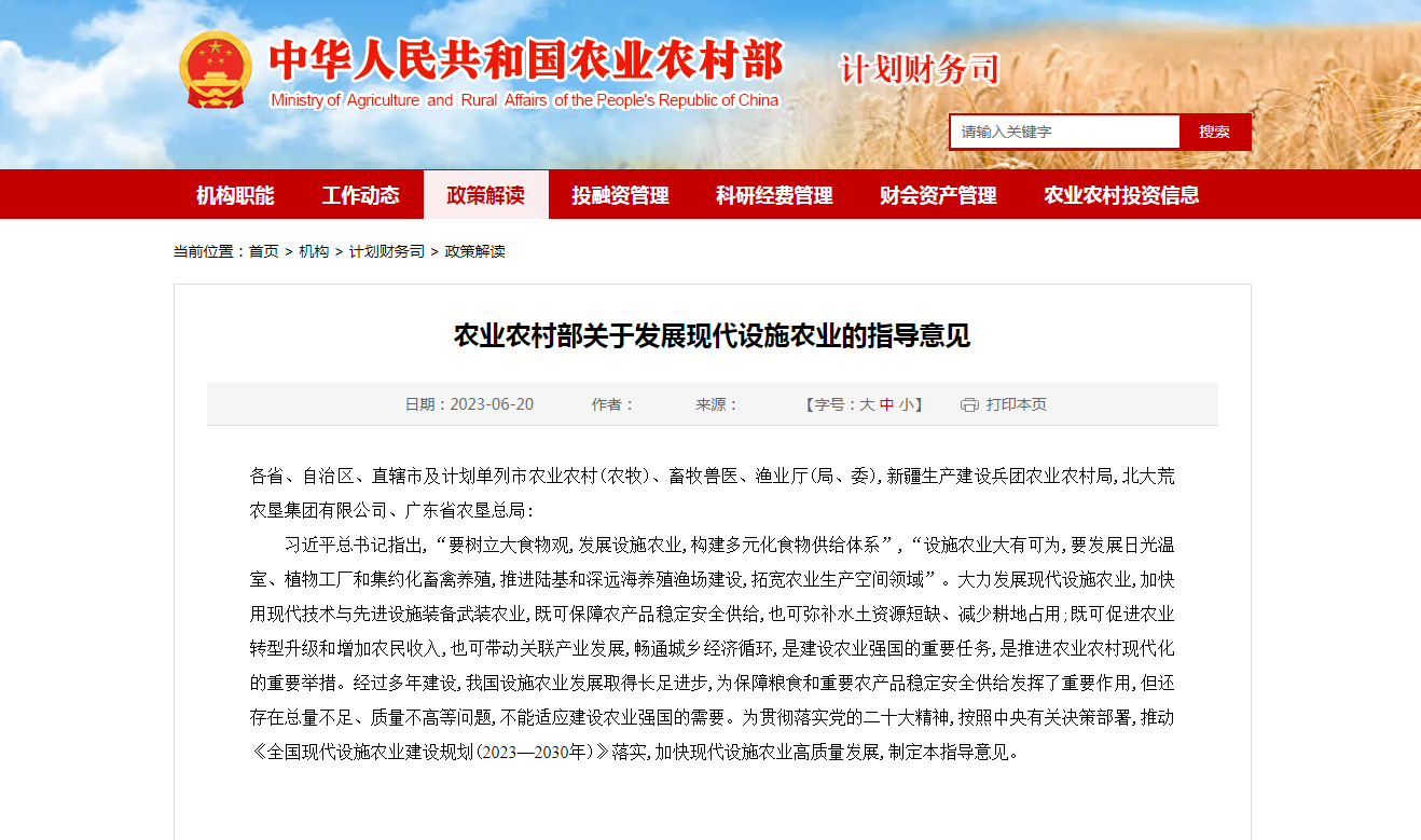 為貫徹落實(shí)黨的二十大精神,按照中央有關(guān)決策部署,推動(dòng)《全國現(xiàn)代設(shè)施農(nóng)業(yè)建設(shè)規(guī)劃(2023—2030年)》落實(shí),加快現(xiàn)代設(shè)施農(nóng)業(yè)高質(zhì)量發(fā)展,農(nóng)業(yè)農(nóng)村部制定《農(nóng)業(yè)農(nóng)村部關(guān)于發(fā)展現(xiàn)代設(shè)施農(nóng)業(yè)的指導(dǎo)意見》(簡稱《意見》),以下為《意見》的重點(diǎn)內(nèi)容: