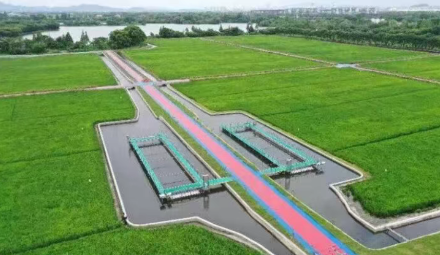 “稻漁共生+跑道養魚”是指通過土地平整、基礎設施改造等措施,穩定糧食生產的前提下,在稻田一側開挖養殖溝,安裝池塘內循環流水槽,通過集中養殖、集中投喂、集中吸污后養殖尾水排入稻田,通過采用稻田凈水與循環水跑道養魚互惠共生系統,可避免對稻田進行大規模改造,減少養魚設施面積,同時優化養殖尾水處理技術,并對獨立的跑道養魚系統進行水體生態環境管控、水質實時監測及系統遠程控制,為稻田綜合種養提供新的技術模式。