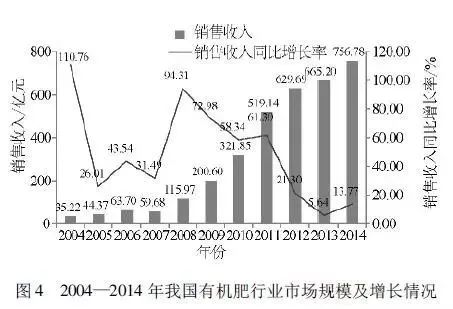 2002 年,我國制訂了有機肥行業標準NY525—2002,有機肥正式進入流通領域,行業進入了快速發展期。經過五六年的初步發展,有機肥的生產技術趨于成熟,市場需求量不斷擴大,產品豐富多樣,從2008 年開始有了爆發式的發展,到2013 年平均銷售額以每年30% 的速度遞增。2004—2014 年我國有機肥行業市場規模及增長情況如圖 4 所示。