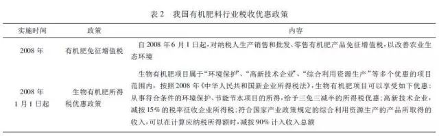 政策可以引導行業發展。近年來,中央高度重視有機肥的施用情況,要求各地大力推廣施用有機肥。2004—2016 年,連續13 年發布以“三農”為主題的中央一號文件,強調了“三農”問題在中國社會主義現代化時期“重中之重”的地位,有機肥作為農業生產的重要環節,除2011 年以外,12 次被納入歷年中央一號文件作為未來產業發展的重點。我國有機肥的主要政策和有機肥行業稅收優惠政策分別見表 1 和表 2。