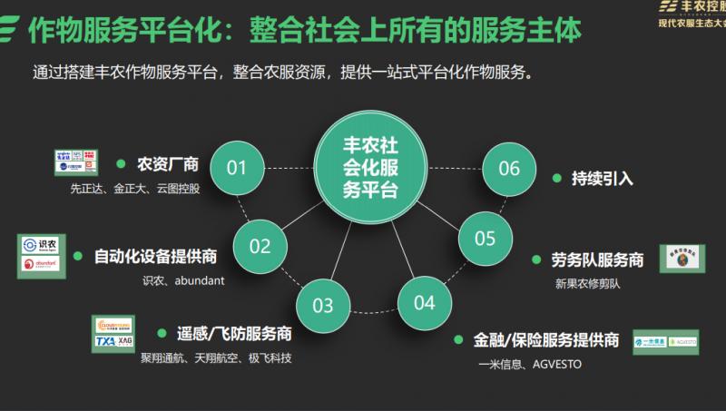 除了打通“種學管賣投”服務生態(tài)之外,豐農(nóng)控股還通過平臺化發(fā)展,讓更多服務商能共建這個大生態(tài)。比如,