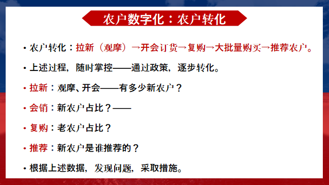 從拉新(觀摩)→開(kāi)會(huì)訂貨→復(fù)購(gòu)→大批量購(gòu)買(mǎi)→推薦農(nóng)戶(hù),這是一個(gè)農(nóng)戶(hù)轉(zhuǎn)化的過(guò)程,也是一個(gè)農(nóng)戶(hù)終身價(jià)值體現(xiàn)的過(guò)程。