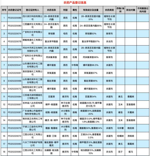 農(nóng)藥登記信息:根據(jù)《農(nóng)藥管理?xiàng)l例》《農(nóng)藥登記管理辦法》等有關(guān)規(guī)定,經(jīng)技術(shù)審查、全國(guó)農(nóng)藥登記評(píng)審委員會(huì)評(píng)審,批準(zhǔn)四川潤(rùn)爾科技有限公司等53家企業(yè)的72個(gè)非新農(nóng)藥產(chǎn)品登記(3個(gè)非新農(nóng)藥產(chǎn)品部分登記),山東魯抗生物農(nóng)藥有限責(zé)任公司等119家企業(yè)的166個(gè)農(nóng)藥產(chǎn)品登記變更(3個(gè)農(nóng)藥產(chǎn)品部分登記變更)。對(duì)批準(zhǔn)登記及登記變更產(chǎn)品頒發(fā)《農(nóng)藥登記證》、核準(zhǔn)標(biāo)簽內(nèi)容(標(biāo)簽內(nèi)容見(jiàn)附件,不再核發(fā)紙質(zhì)標(biāo)簽)。