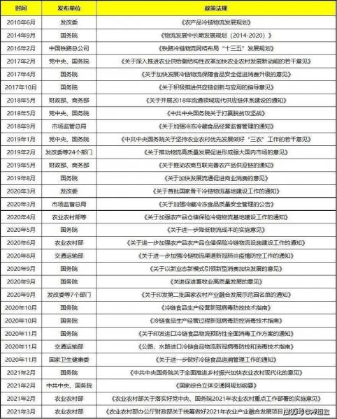 截止2021年3月,國(guó)家相關(guān)部門發(fā)布的一系列有關(guān)冷鏈物流行業(yè)發(fā)展的政策法規(guī),主要聚焦在冷鏈物流基礎(chǔ)設(shè)施建設(shè)、冷鏈物流體系建設(shè)、促進(jìn)農(nóng)產(chǎn)品流通等方面,極大地促進(jìn)了國(guó)內(nèi)冷鏈物流行業(yè)發(fā)展,新規(guī)新標(biāo)準(zhǔn)將快速催生行業(yè)迭代,為行業(yè)的快速良性發(fā)展保駕護(hù)航。