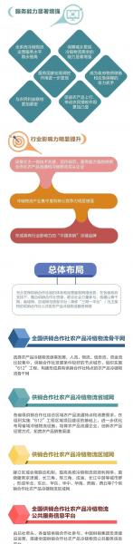 《規(guī)劃》內(nèi)容包含六個(gè)部分,從構(gòu)建全國供銷合作社農(nóng)產(chǎn)品冷鏈物流骨干網(wǎng)、供銷合作社農(nóng)產(chǎn)品冷鏈物流省域網(wǎng)、供銷合作社農(nóng)產(chǎn)品冷鏈物流區(qū)域網(wǎng)與全國供銷合作社農(nóng)產(chǎn)品冷鏈物流公共服務(wù)信息平臺(tái)進(jìn)行總體布局,并設(shè)立了供銷合作社系統(tǒng)公共型農(nóng)產(chǎn)品冷鏈物流建設(shè)工程(“612”工程)、供銷合作社農(nóng)產(chǎn)品冷鏈物流先行省省域網(wǎng)建設(shè)工程兩個(gè)專欄。提出了建立全系統(tǒng)冷鏈物流發(fā)展運(yùn)行機(jī)制、培育壯大農(nóng)產(chǎn)品流通龍頭企業(yè)、加強(qiáng)農(nóng)產(chǎn)品產(chǎn)地冷鏈物流設(shè)施建設(shè)、強(qiáng)化農(nóng)產(chǎn)品冷鏈物流樞紐基地輻射功能、推進(jìn)農(nóng)產(chǎn)品銷地冷鏈物流設(shè)施建設(shè)、提升農(nóng)產(chǎn)品冷鏈物流經(jīng)營服務(wù)水平、促進(jìn)城鄉(xiāng)冷鏈網(wǎng)絡(luò)雙向融合、加快冷鏈物流科技標(biāo)準(zhǔn)應(yīng)用和品牌建設(shè)等8項(xiàng)重點(diǎn)任務(wù)。