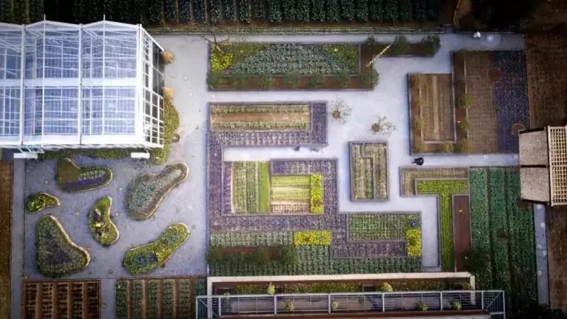 站在巨大的露臺(tái)上,憑欄俯瞰,一派田園風(fēng)光盡收眼底:從腳下的景觀小院,蔬菜花園、迷宮和廊架,老樹(shù)下的休憩區(qū),到近處的玻璃暖房、生態(tài)泳池……