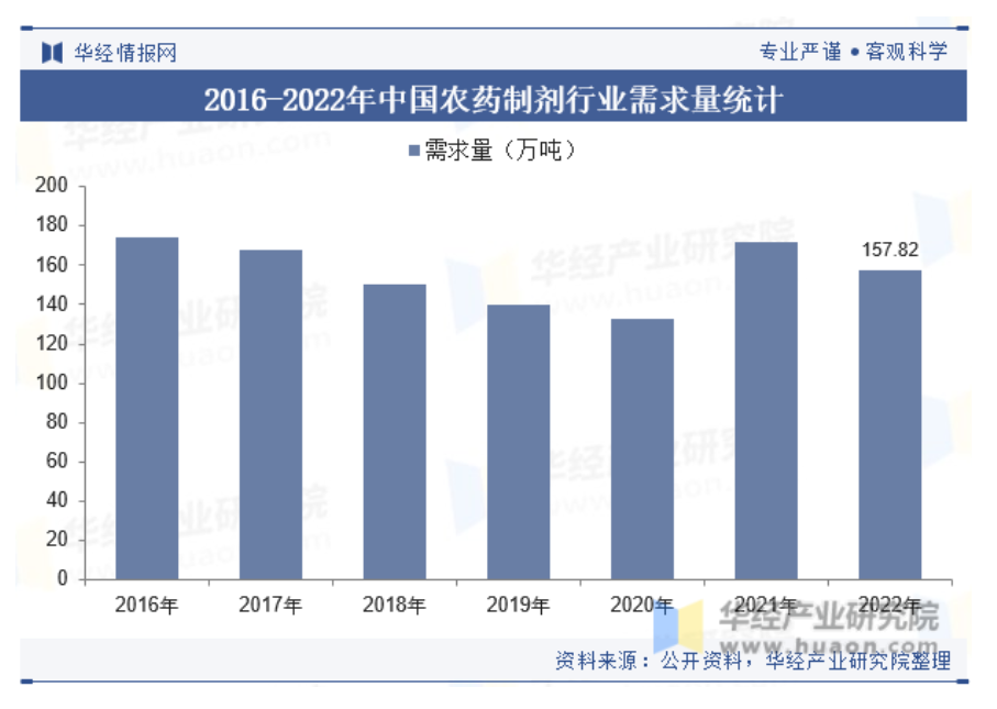 隨著農業現代化的推進和農業生產方式的轉變,農戶和農業生產企業對農藥制劑的需求呈現出多樣化、高效化和環保化的趨勢。據數據,2022年我國對農藥制劑的需求量為157.82萬噸,同比下降8.2%。