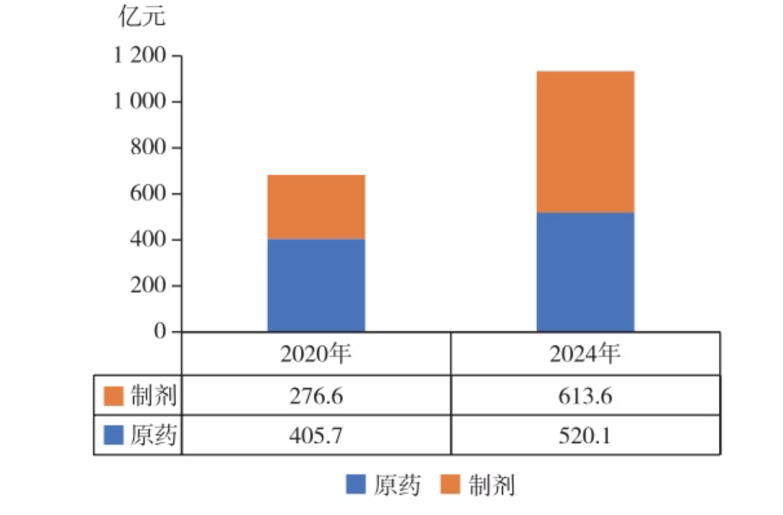 圖4  2020、2024年我國原藥和制劑出口額變化情況(RMB)