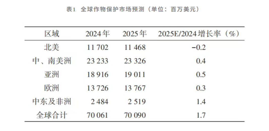 盡管在2024年,作物保護市場因不利天氣、高庫存、貨幣動蕩,銷售急劇下降,但筆者預計2025年除北美外全球農藥市場需求將獲得一定幅度恢復性增長(表1)。