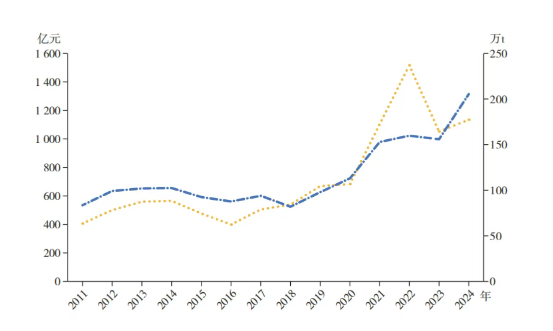圖3  2011—2024年我國農藥出口折百量和金額變化情況(單位:億元(RMB);萬t)