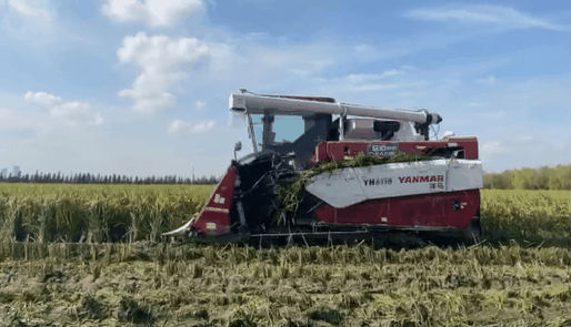 無人駕駛收割機所到之處,成熟的水稻被整齊地割斷,經(jīng)過脫粒、卸糧、裝糧,變成一堆堆金黃色的稻粒。
