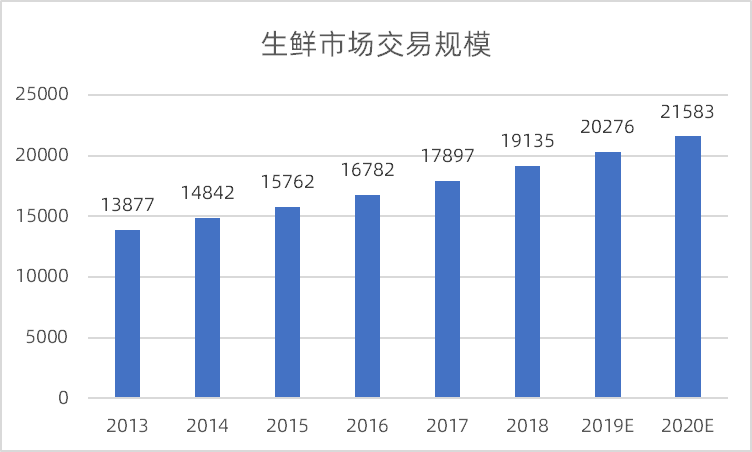 據統計,國內生鮮市場規模自 2013 年以來保持 6%以上增速,2019年生鮮市場交易規模超過2萬億。在購買頻次上,我國生鮮消費者平均每周購買3次,其中水果蔬菜頻次為4.48次,魚類水產為2.39次。