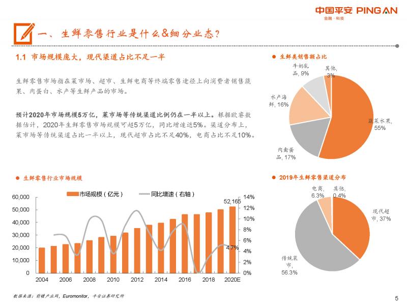 生鮮零售市場(chǎng)指在菜市場(chǎng)、超市、生鮮電商等終端零售途徑上向消費(fèi)者銷售蔬果、肉蛋白、水產(chǎn)等生鮮產(chǎn)品的市場(chǎng)。根據(jù)歐睿數(shù)據(jù)估計(jì),2020年生鮮零售市場(chǎng)規(guī)模可超5萬(wàn)億。渠道分布上,菜市場(chǎng)等傳統(tǒng)渠道占比一半以上,超市、生鮮電商等現(xiàn)代渠道取代傳統(tǒng)渠道的空間巨大。