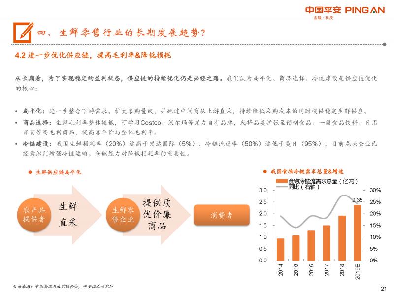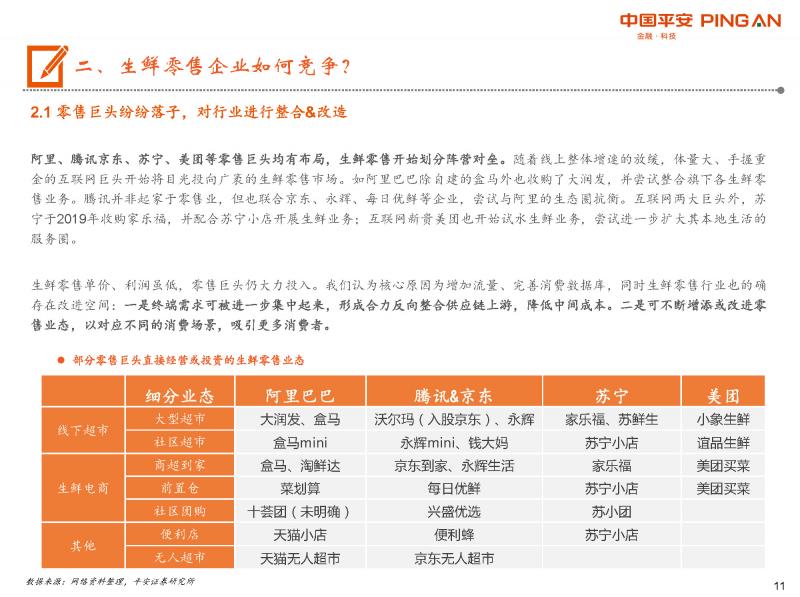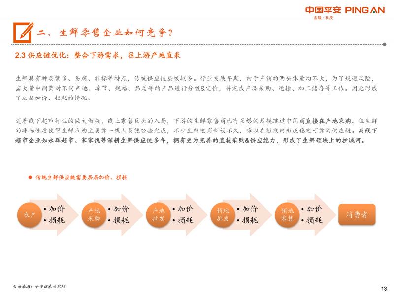 線上線下零售巨頭均在生鮮零售各領(lǐng)域大規(guī)模布局,行業(yè)開始劃分陣營(yíng)對(duì)壘。其次,生鮮零售的盈利模型決定供應(yīng)鏈&消費(fèi)者觸達(dá)為競(jìng)爭(zhēng)核心:1、企業(yè)不斷整合下游需求、往上游直采,持續(xù)優(yōu)化供應(yīng)鏈。2、企業(yè)嘗試同時(shí)經(jīng)營(yíng)多種業(yè)態(tài),進(jìn)一步貼近消費(fèi)者,擴(kuò)大消費(fèi)群體。