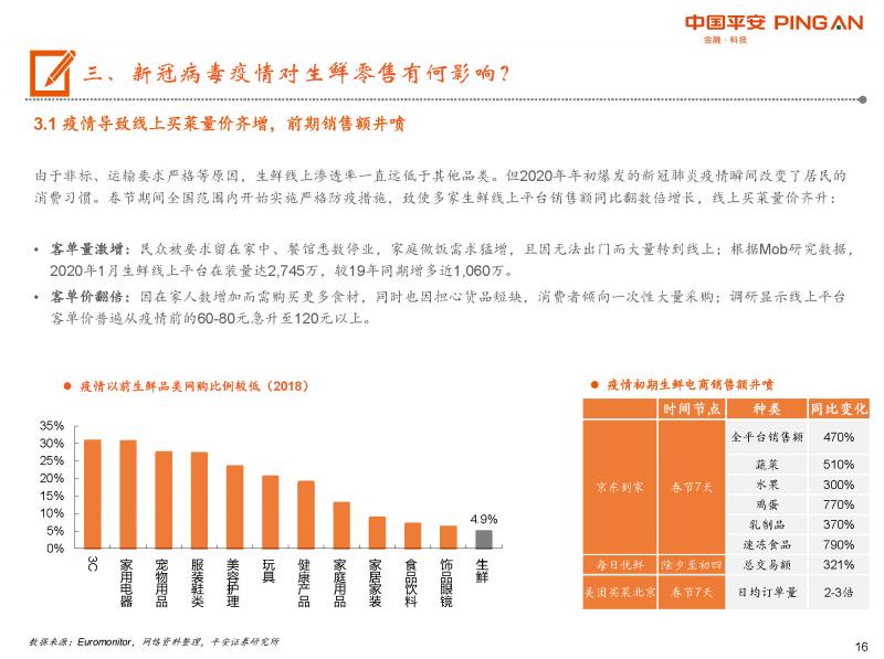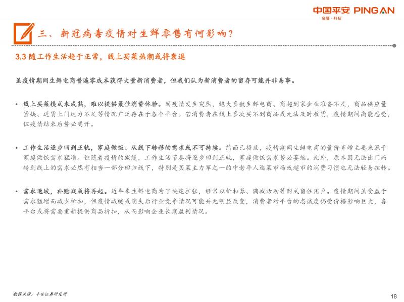疫情導(dǎo)致線上買菜量?jī)r(jià)齊增,生鮮電商銷售額井噴。特別是新用戶數(shù)大幅增加、消費(fèi)人群發(fā)生改變,因此本次疫情或是培養(yǎng)生鮮線上消費(fèi)習(xí)慣的一次良機(jī)。但我們認(rèn)為新消費(fèi)者的留存可能并非易事:1、線上買菜模式未成熟,難以提供最佳消費(fèi)體驗(yàn)。2、隨著工作生活逐步回到正軌,家庭做飯、從線下轉(zhuǎn)移的需求或不可持續(xù)。3、需求退坡后補(bǔ)貼戰(zhàn)或?qū)⒃倨稹?/span>