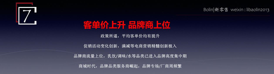 第7個(gè)大的變化是目前的客單價(jià)都在提升,這是比較好的一個(gè)點(diǎn),由過(guò)去靠低價(jià)來(lái)操作運(yùn)營(yíng)的模式已經(jīng)轉(zhuǎn)變了。這個(gè)以品類(lèi)以滿(mǎn)減、買(mǎi)贈(zèng)、捆綁等營(yíng)銷(xiāo)創(chuàng)新的手段都回歸到電商運(yùn)營(yíng)的時(shí)代。在這種背景下,基本上來(lái)講,所有的品牌都有機(jī)會(huì)。在過(guò)去的兩三年里,品牌商最害怕的就是摧毀企業(yè)產(chǎn)品價(jià)盤(pán)的這種力量,但是今天為止這種作用力會(huì)越來(lái)越小,品牌商也越來(lái)越越多的參與到賽道里面。