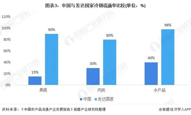 數據顯示,我國水產品、肉類、果蔬冷藏流通率分別為40%、30%、15%,全程冷鏈覆蓋率分別僅為23%、15%和5%,而日本、美國生鮮品冷藏流通率分別達98%以及80%-90%。
