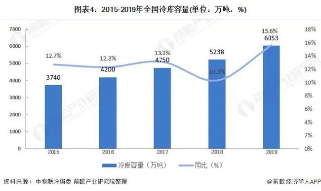 在冷庫總量方面,我國冷庫市場發展態勢明顯。據中物聯冷鏈委不完全統計,2019年全國冷庫總量達到約6053萬噸(折合約1.51億立方米),新增庫容815萬噸,同比增長15.56%。