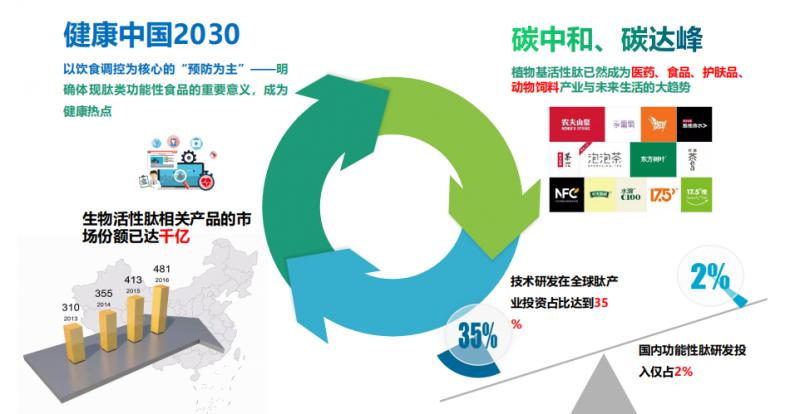 第二、國家推行碳中和碳達峰,目前,食品科技發展新趨勢是從植物基入手,開啟綠色食品新賽道。比如說,從大豆、小米、青稞、燕麥等等傳統的食物里面去提取出具有功能性很強的活性肽,這也是完全是符合國家推行碳中和、碳達峰的時代大背景。