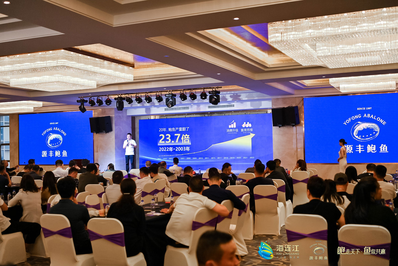 本次大會(huì)邀請(qǐng)農(nóng)業(yè)農(nóng)村部總畜牧師、農(nóng)村合作經(jīng)濟(jì)指導(dǎo)司司長(zhǎng)張?zhí)熳粢曨l致辭,福建省海洋與漁業(yè)局副局長(zhǎng)邱章泉、中共連江縣委書(shū)記陳勁松先后致辭,福州源豐海洋科技有限公司董事長(zhǎng)肖良棟介紹企業(yè)情況,福建農(nóng)林大學(xué)副校長(zhǎng)鄭寶東,福州市海洋與漁業(yè)局副局長(zhǎng)陳明東,連江縣人民政府副縣長(zhǎng)劉麟翔、雷發(fā)勇參加會(huì)議。全國(guó)生態(tài)食材與生態(tài)餐飲評(píng)定中心主任、國(guó)務(wù)院國(guó)資委職業(yè)經(jīng)理研究中心食.宿業(yè)委員會(huì)主任、全國(guó)職業(yè)技能鑒定中式烹調(diào)專家委員會(huì)主任、中國(guó)烹飪領(lǐng)軍人物高炳義,中國(guó)食品工業(yè)協(xié)會(huì)經(jīng)銷商工作委員會(huì)秘書(shū)長(zhǎng)、中國(guó)食品工業(yè)雜志社社長(zhǎng)、中國(guó)食品產(chǎn)教融合共同體執(zhí)行理事長(zhǎng)李葆華,中國(guó)普惠金融研究院高級(jí)研究員、中國(guó)人民大學(xué)小微金融研究中心原執(zhí)行主任劉澄清教授、CPCP創(chuàng)始人兼秘書(shū)長(zhǎng)劉澄清,廈門大學(xué)海洋與地球?qū)W院教授/博士生導(dǎo)師、中國(guó)水產(chǎn)流通與加工協(xié)會(huì)鮑魚(yú)分會(huì)秘書(shū)長(zhǎng)、國(guó)家貝類產(chǎn)業(yè)技術(shù)體系鮑遺傳改良崗位科學(xué)家游偉偉,中科院青島海洋研究所副教授/中國(guó)水產(chǎn)流通與加工協(xié)會(huì)鮑魚(yú)分會(huì)執(zhí)行會(huì)長(zhǎng)吳富村,福建農(nóng)林大學(xué)食品科學(xué)學(xué)院副教授林少玲等分享鮑魚(yú)行業(yè)發(fā)展趨勢(shì)和行業(yè)研究成果。300多位領(lǐng)導(dǎo)及嘉賓、全國(guó)各地經(jīng)銷商、媒體蒞臨現(xiàn)場(chǎng)共同為連江鮑魚(yú)產(chǎn)業(yè)高質(zhì)量發(fā)展出謀劃策,共述情誼、共商合作、共話未來(lái)。