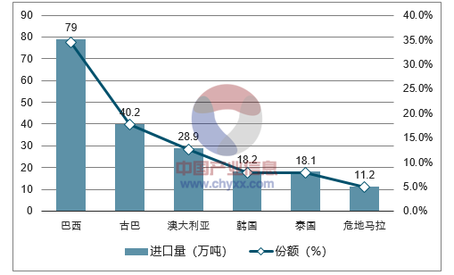 2017年以前,我國食糖主要進口來源國為巴西、古巴和泰國,三國占我國進口食糖總量的90%左右。但2017年,情況發生了一些變化:第一,食糖進口來源國排在首位的依然是巴西,但是巴西糖進口量大幅減少,由2016年食糖進口量198.9萬噸減少為2017年的79.0萬噸,減幅高達60.3%,并且巴西進口份額也由65.0%下降為34.5%。