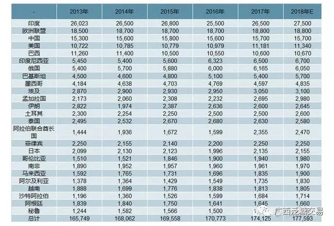 【表】2013-2018年全球食糖產量分國家統計(千噸)(圖片來源:中國產業信息網)