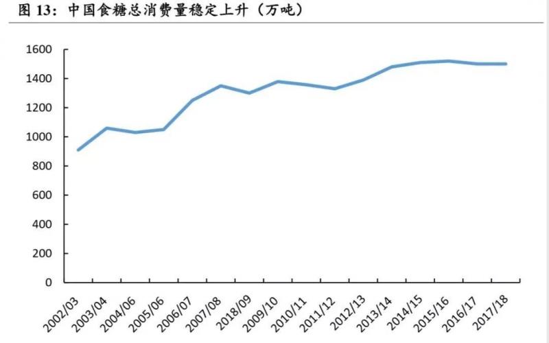 消費方面,中國是一個食糖大國。自2003年以來,中國糖總消費量由910萬噸增長至1500萬噸,增長了近65%。這一方面源于中國人口增長,另一方面也源于經濟的增長以及制糖業的發展。