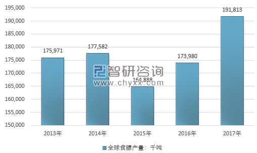 【圖】2013—2017全球食糖產量(圖片來源:智研咨詢)