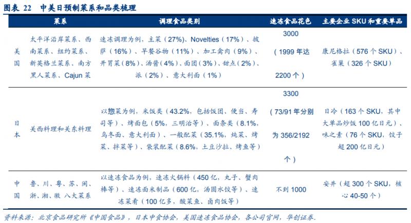 整體而言美日品類較為復(fù)雜,相較之下我國的菜品種類更多,而當(dāng)下主要品類尚不及美日,考慮到我國擁有更大的市場規(guī)模,未來有更多挖掘空間。