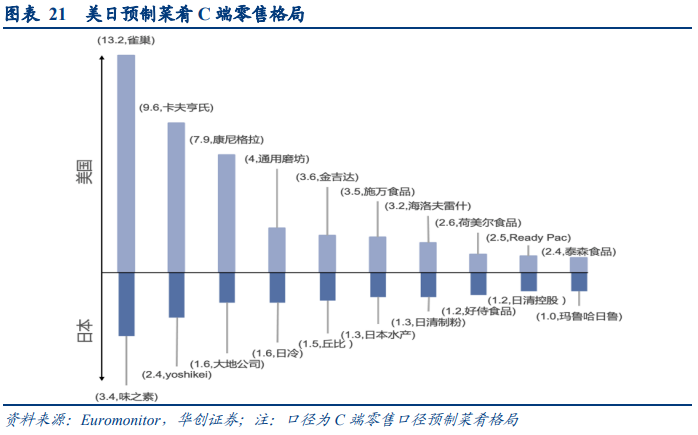 因預(yù)制菜相比速凍食品復(fù)雜程度較高,即使在美日也難有企業(yè)一家獨大,更多體現(xiàn)為細分賽道差異競爭。