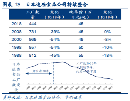 復(fù)盤日本速凍食品行業(yè),90年代黃金期結(jié)束后,日本速凍食品工廠數(shù)在2000年到頂,隨后步入殘酷洗牌階段,2018年降為高峰值一半,龍頭依托高效率經(jīng)營抵抗價格戰(zhàn)壓力,最終贏者通吃、剩者為王,至2018年行業(yè) CR3約60%。