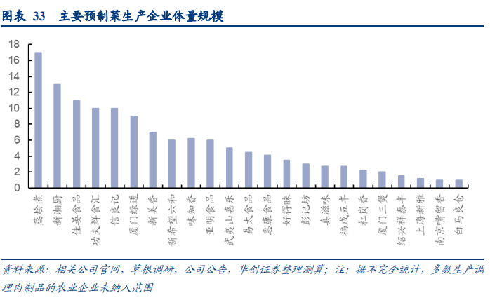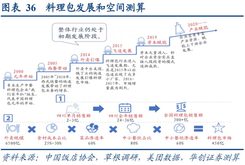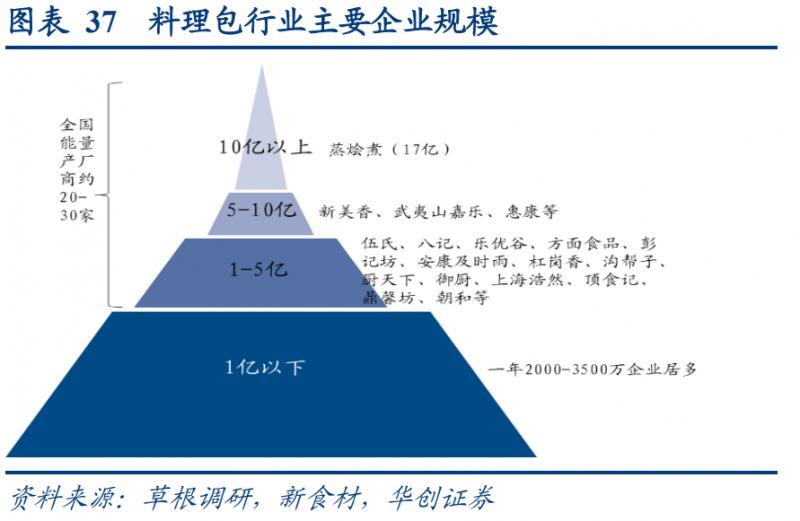 料理包下游主要對接小餐飲,不存在大型餐飲開發(fā)依托客戶關(guān)系、自建央廚反向替代等因素,整體競爭較為市場化,區(qū)域龍頭依托當(dāng)?shù)厍谰W(wǎng)絡(luò)后可形成較強優(yōu)勢。根據(jù)不同口徑,華創(chuàng)證券測算得全國規(guī)模約在500億級別左右。