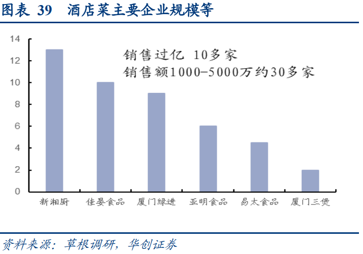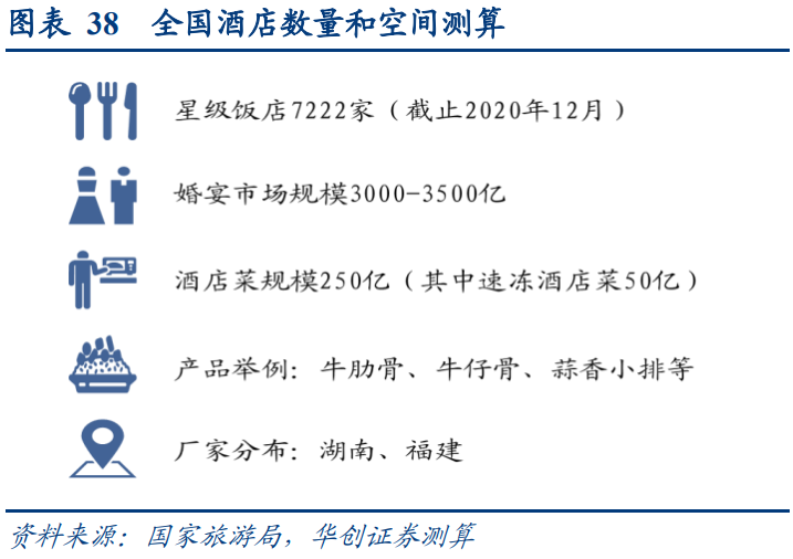 目前主要玩家有速凍酒店菜肴類企業(yè),如福建的綠進、亞明等,也有常溫/冷藏型酒店菜肴,如湖南的新湘廚、佳晏食品等,除此之外大型餐飲企業(yè)依托研發(fā)優(yōu)勢也紛紛進入。酒店菜多用于宴席市場等,假設(shè)滲透率在15-20%左右(略高于行業(yè)),預(yù)計酒店菜規(guī)模約有250億,其中速凍酒店菜肴規(guī)模約在50億以上。