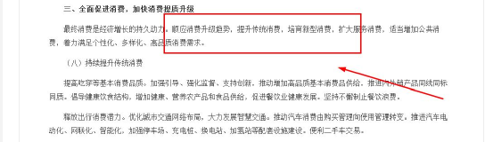 從汽車、旅游、醫(yī)療消費、教育消費到住房,到吃穿基礎(chǔ)消費,倡導(dǎo)健康飲食結(jié)構(gòu),增加健康、營養(yǎng)農(nóng)產(chǎn)品和食品供給,促進(jìn)餐飲業(yè)健康發(fā)展。