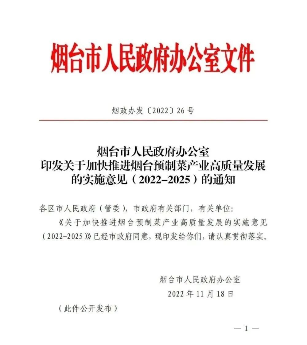 2022年11月,煙臺市人民政府辦公室印發了《關于加快推進煙臺預制菜產業高質量發展的實施意見(2022-2025)》(下文簡稱《意見》)。