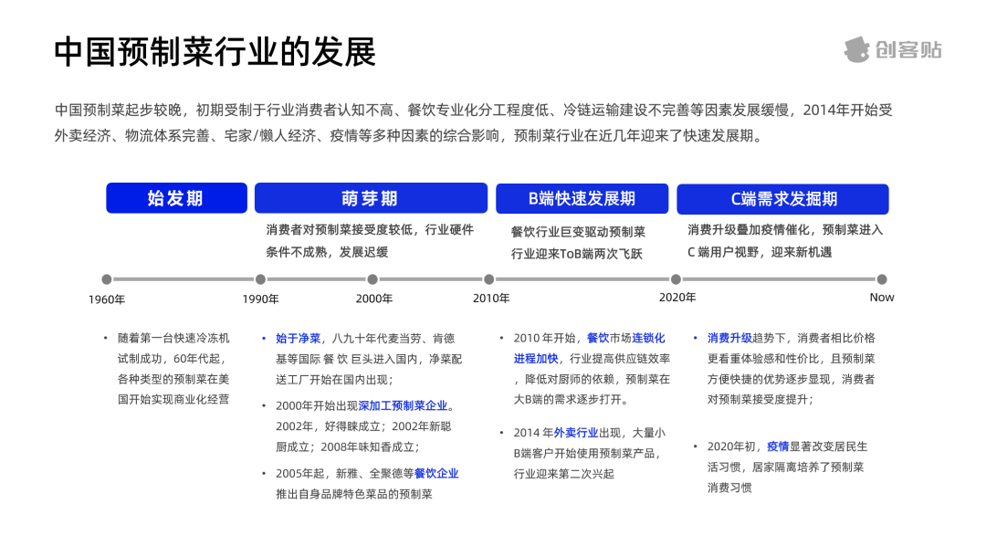 但在很長的一段時間里,我國預制菜發展相對緩慢。隨著城市生活節奏加快,餐飲連鎖化趨勢對食材標準化進程加速等多因素共同作用下,預制菜在B端實現高速發展。而在最近三年來的疫情影響下,預制菜在C端迎來加速發展。