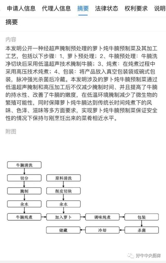 “一種經(jīng)超聲腌制預(yù)處理的蘿卜燉牛腩預(yù)制菜及其加工工藝”專利信息示例  數(shù)據(jù)來源:天眼查
