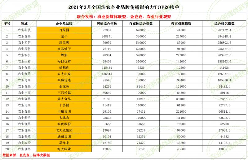 【榜單】3月全國(guó)涉農(nóng)企業(yè)品牌傳播影響力TOP20榜單:新傳播成主流