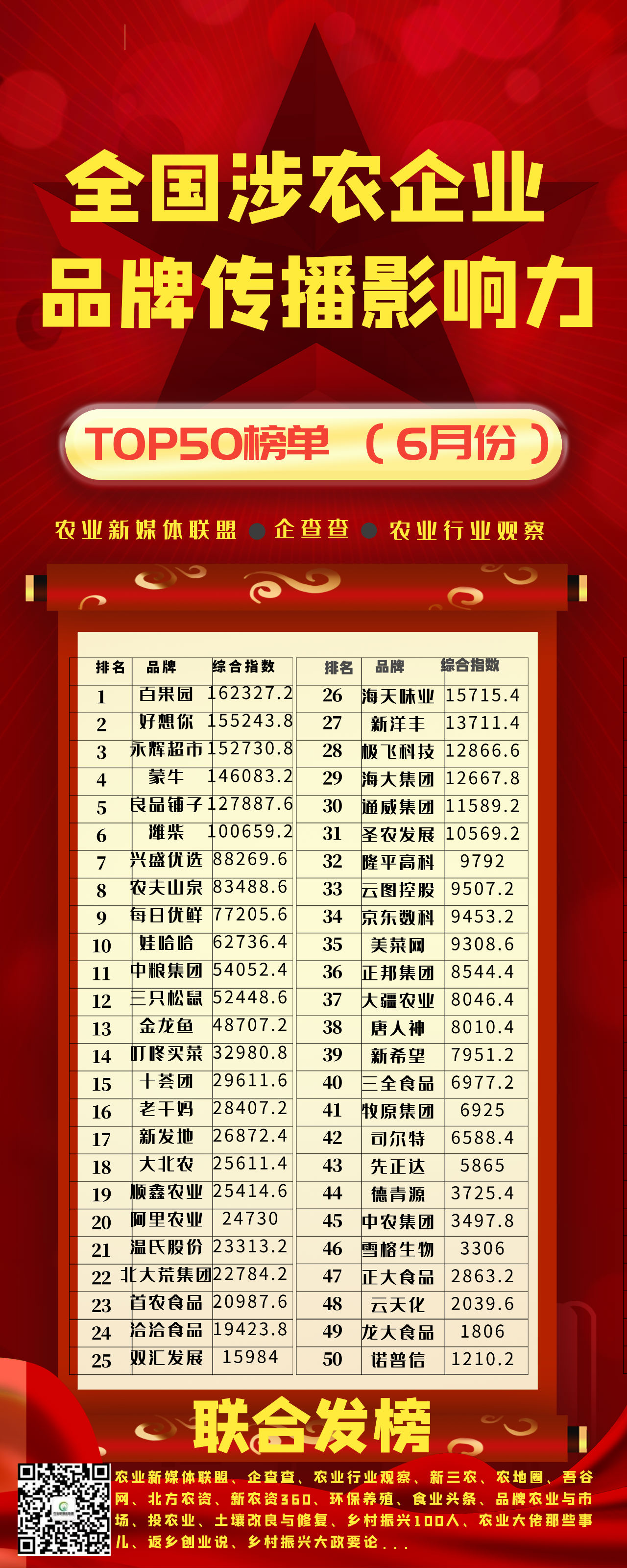該數(shù)據(jù)榜單結(jié)合農(nóng)業(yè)新媒體聯(lián)盟、農(nóng)業(yè)行業(yè)觀察、企查查、清博大數(shù)據(jù)、16家三農(nóng)領(lǐng)域新媒體等各項(xiàng)數(shù)據(jù)統(tǒng)計(jì)及收集的信息,共涉及50家涉農(nóng)企業(yè)及品牌。透視本屆榜單,群星閃耀、行業(yè)頭部企業(yè)、平臺(tái)企業(yè)紛紛入榜。
